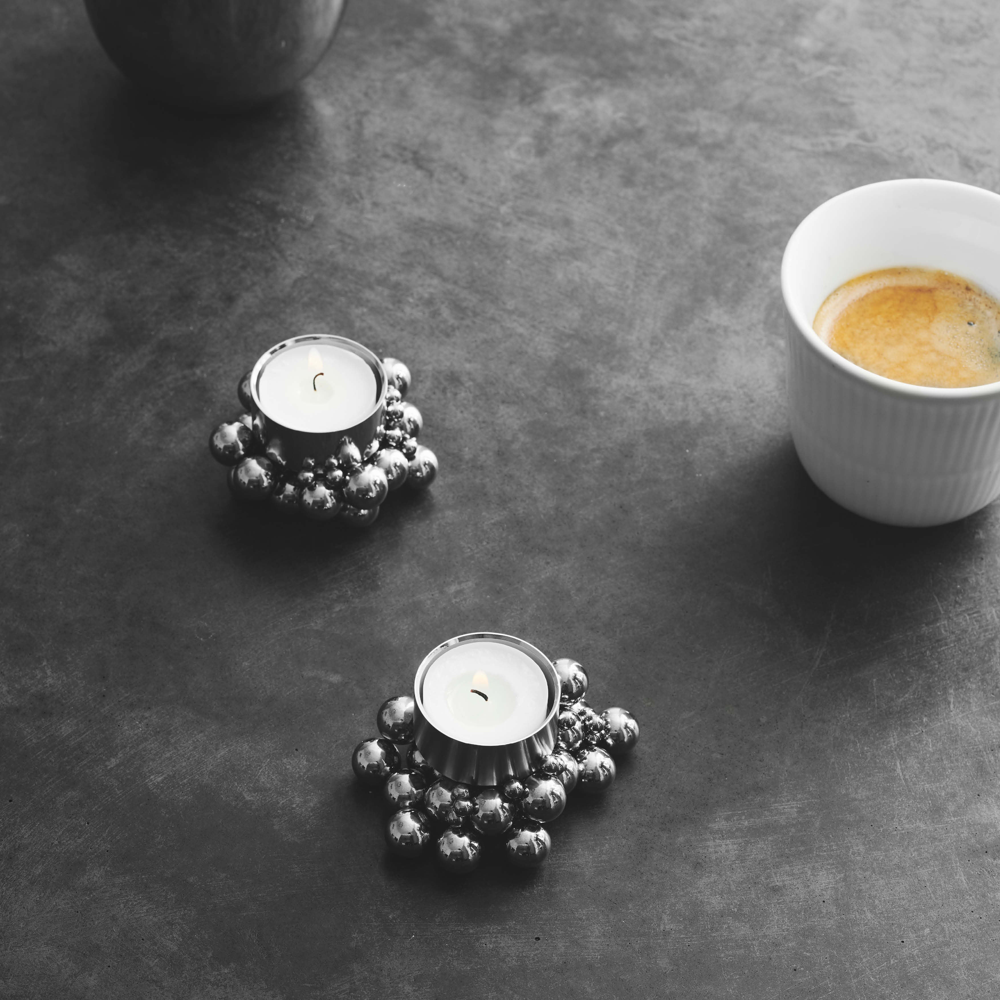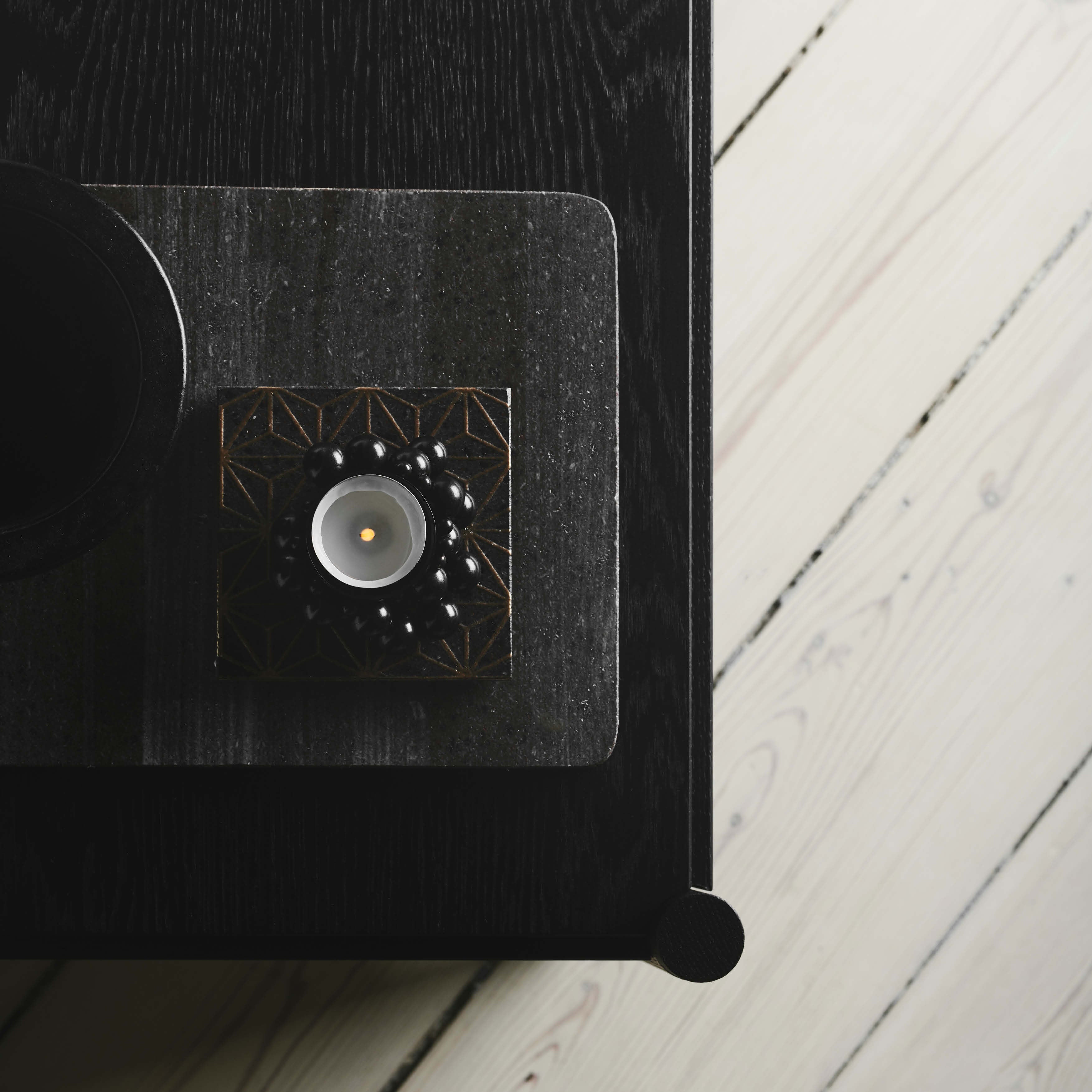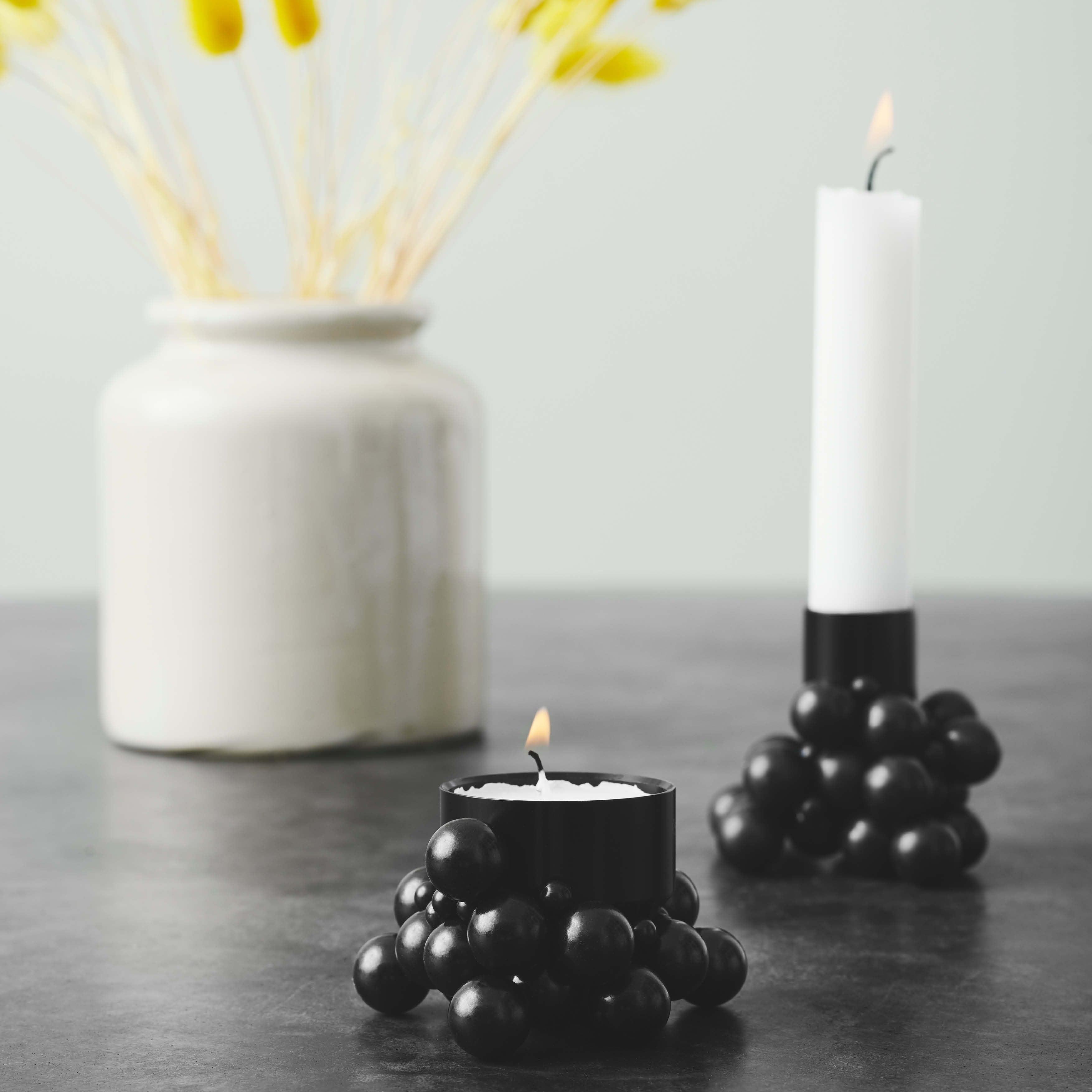 Brug fyrfadslysestagen som udsmykning på bordet eller i vindueskarmen. Leg med den, og lav dekorative opsætninger. Sæt flere Molekyl sammen for at skabe en traditionel adventsstage. Lav en skulpturel ved at placere selve lysholderen på toppen af kuglerne, så det ligner, at lyset svæver over en gruppe molekyler. For at udfordre tyngdekraften kan man sågar placere nogle af stålkuglerne under en tynd flade. Placere selve lysholderen oven på. Molekyl tealight 1 fyrfadslysestage fås i varianterne sort, krom og messing. På den måde kan den både signalere det klassiske, rå og eksklusive.
