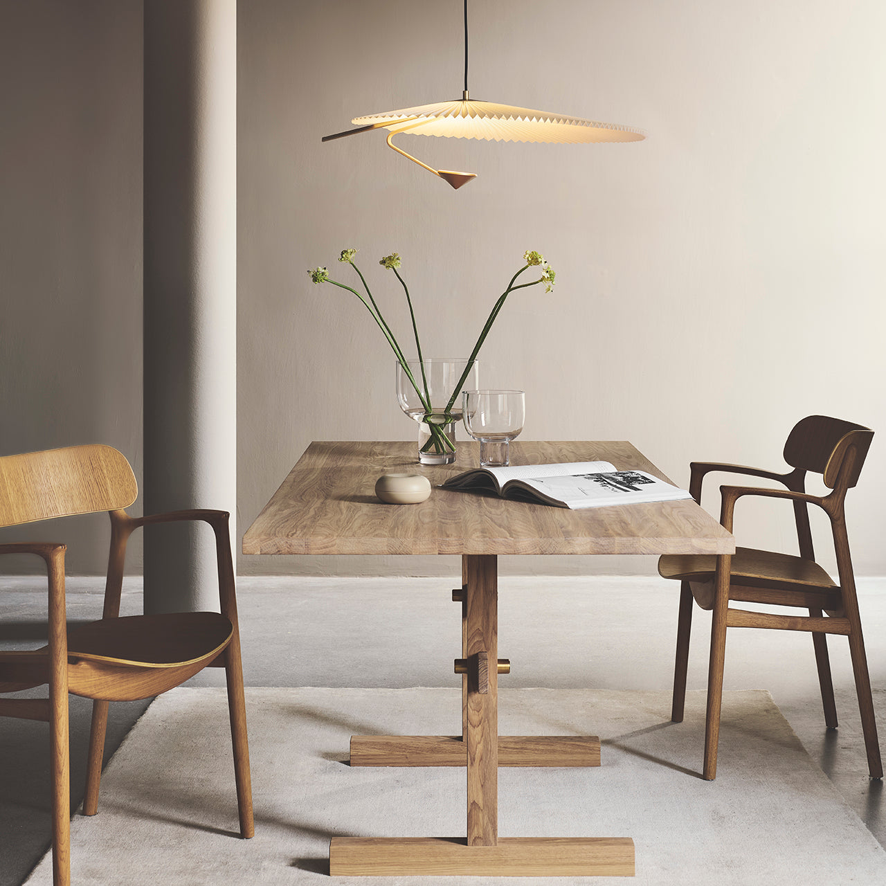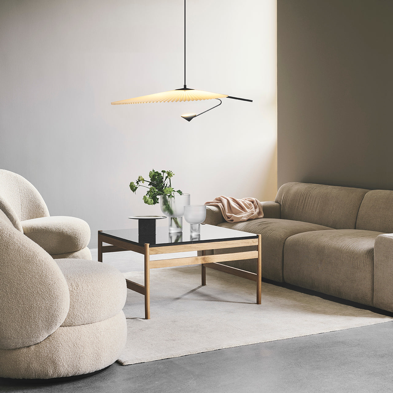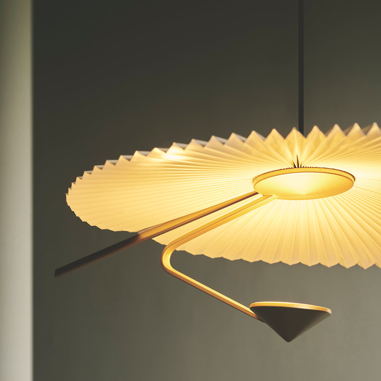 Det begyndte med en bordlampe, og udviklede sig til en fuld kollektion af pendel, gulvlampe, væglampe og bordlampe. Vores mål var at forene viftens legende og håndlavede udtryk med en moderne industribase. Ved at integrere en lille forhøjet LED-lys-kilde omdannede vi den foldede vifte til både en lampeskærm og en reflektor. Når den placeres mod en væg, udsender lampen blødt, jævnt fordelt omgivelseslys.