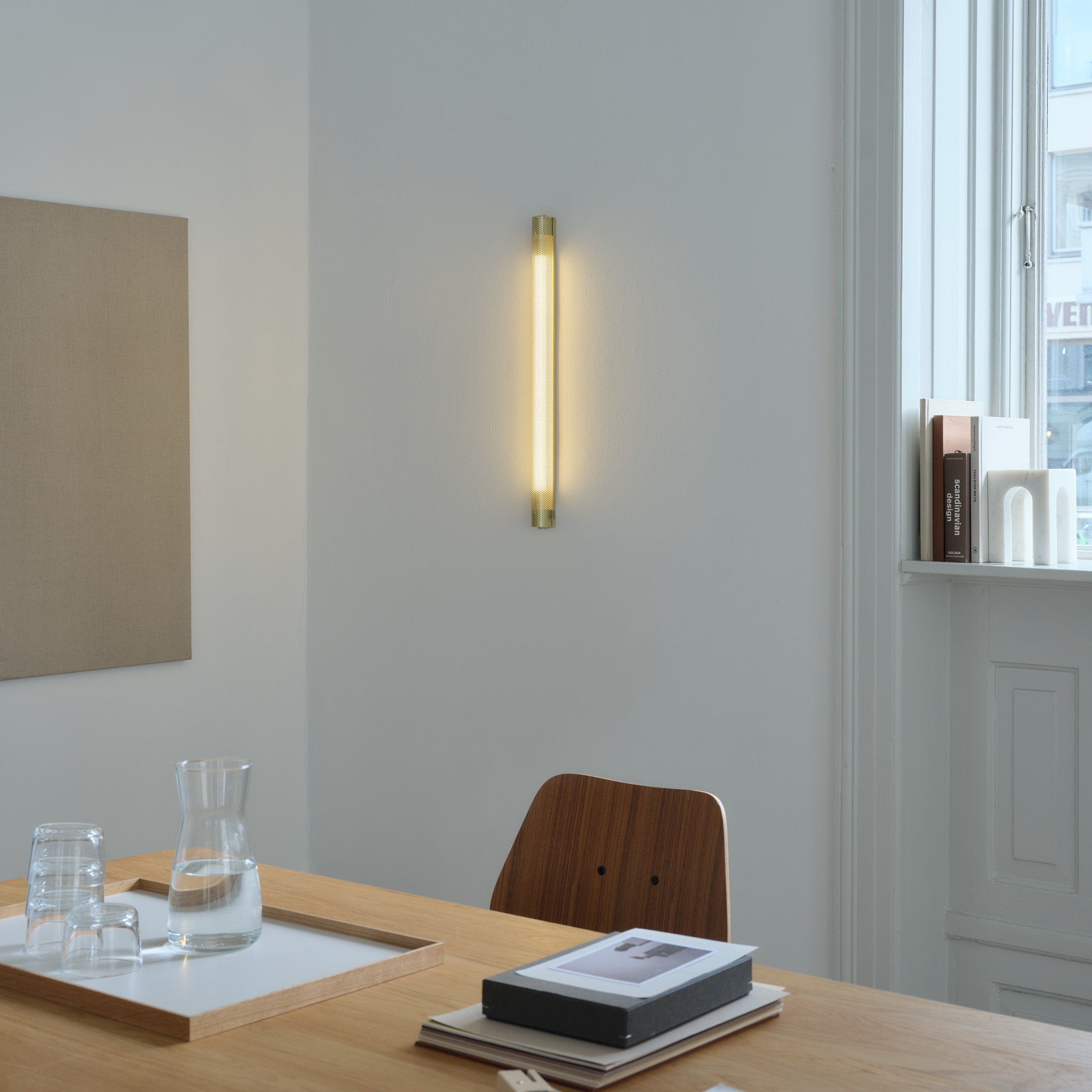Radent Hardwired væglampe er designet omkring et standard LED lysrør for at skabe et smalt, stramt og elegant lampe design. Radent hardwired væglampen giver en fed rumbelysning og ikke mindst en fed detalje i din indretning. Radent hardwired væglampen findes i en længde og 4 varianter: sort, hvid, messing og stål.