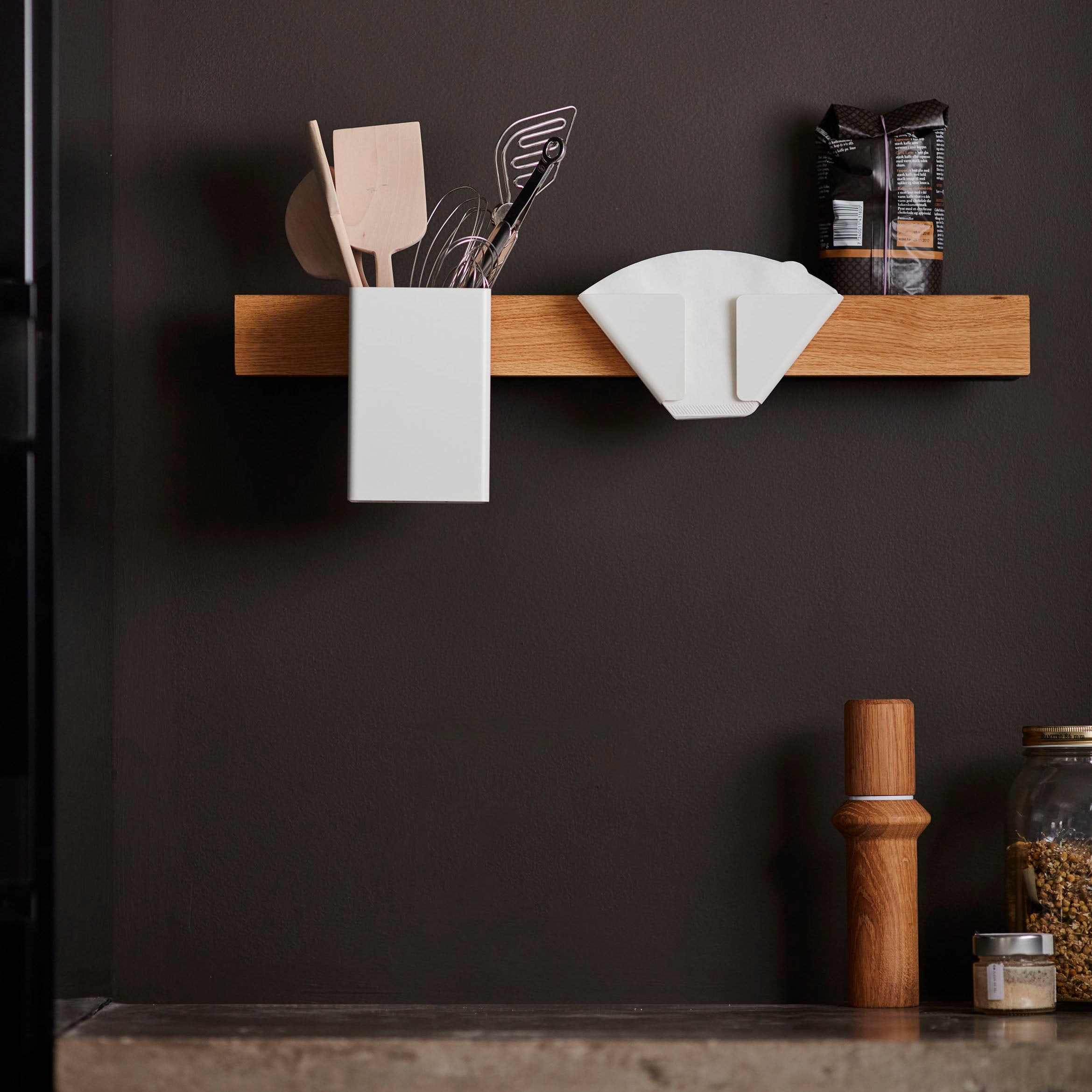 Brug den multifunktionelle hylde i køkkenet til krydderierne, som gallerihylde til dine flotte kogebøger, eller som knivholder. Kombiner fx hylderne med Flex boks til krydderurterne og Flex kaffefilterholder. Tilkøb Flex spejl og Flex knager, og brug Flex i entreen, hvor der fremover altid er styr på nøglerne, da de kan hænge direkte på hylden på grund af den kraftige magnet.