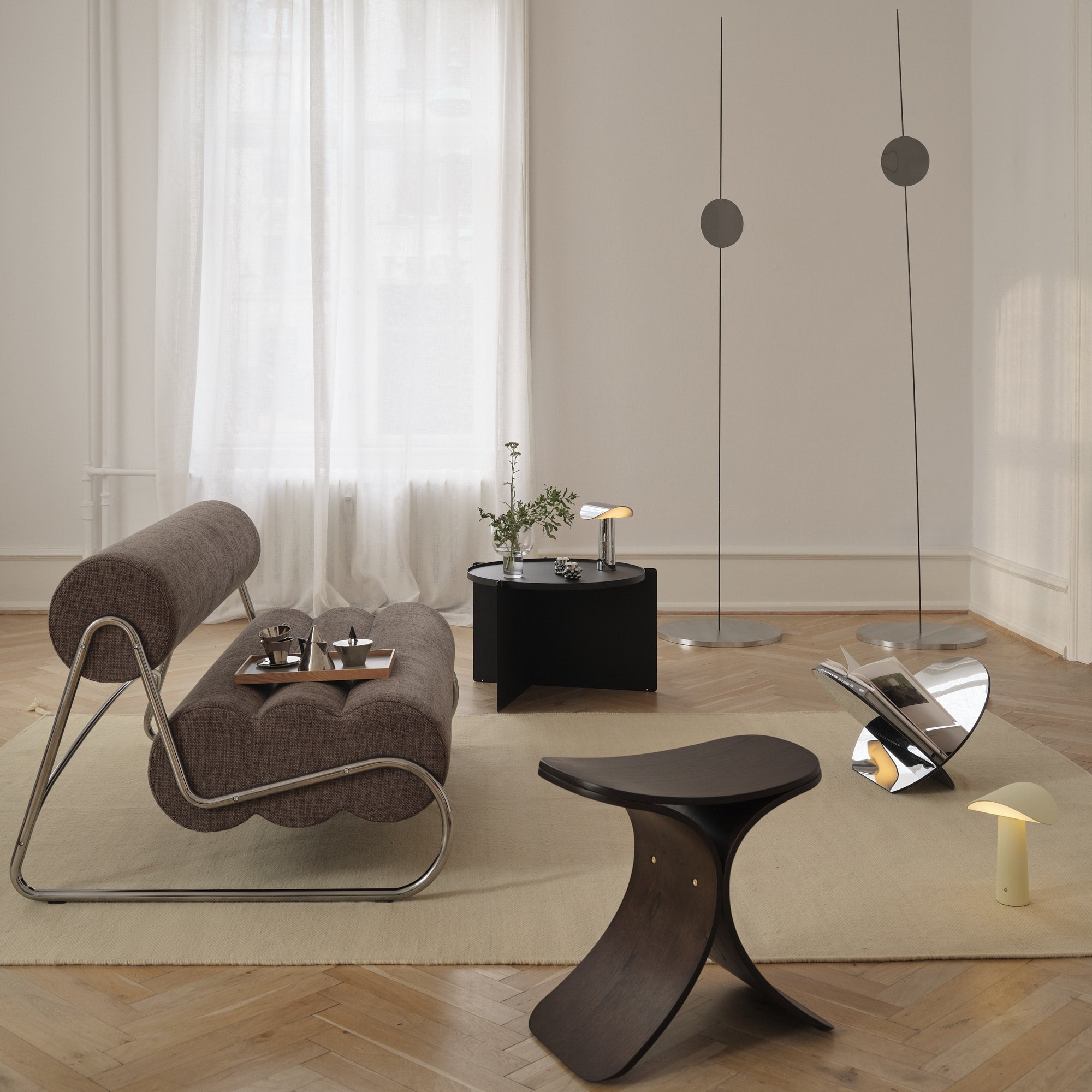 Luno er udviklet til at fungere fritstående i et rum eller diskret placeret langs en væg. Dens organiske form giver et naturligt flow i indretningen, mens de omhyggeligt udvalgte materialer understreger dens solide kvalitet. Skamlen fås i 5 varianter: nyhederne i eg og mørk eg - uden tekstil samt variationerne mørk eg med mørk beige tekstil, eg med beige tekstil og sort eg med sort læder. Uanset kombinationen er hver model skabt til at passe ind i forskellige miljøer - fra private hjem til kontorer, hoteller og museer.