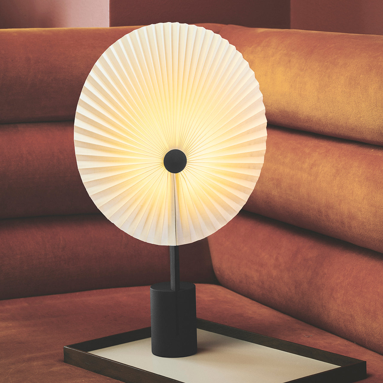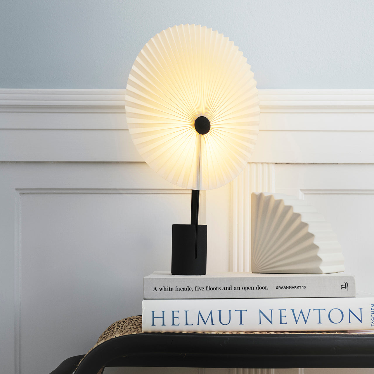 Det begyndte med en bordlampe, og udviklede sig til en fuld kollektion af pendel, gulvlampe, væglampe og bordlampe. Vores mål var at forene viftens legende og håndlavede udtryk med en moderne industribase. Ved at integrere en lille forhøjet LED-lys-kilde omdannede vi den foldede vifte til både en lampeskærm og en reflektor. Når den placeres mod en væg, udsender lampen blødt, jævnt fordelt omgivelseslys.