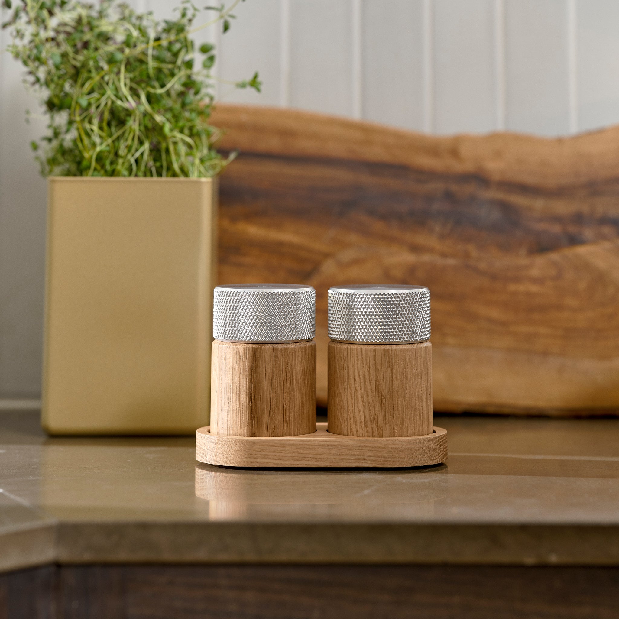 Sina er ikke kun et redskab til madlavningen, men også et smukt element på spisebordet. De to kværne leveres med en elegant bakke, der ikke blot præsenterer sættet på fineste vis, men også hjælper med at holde bordet fri for krydderirester. Diskrete markeringer på hver kværn angiver, hvilken der er til salt, og hvilken der er til peber.